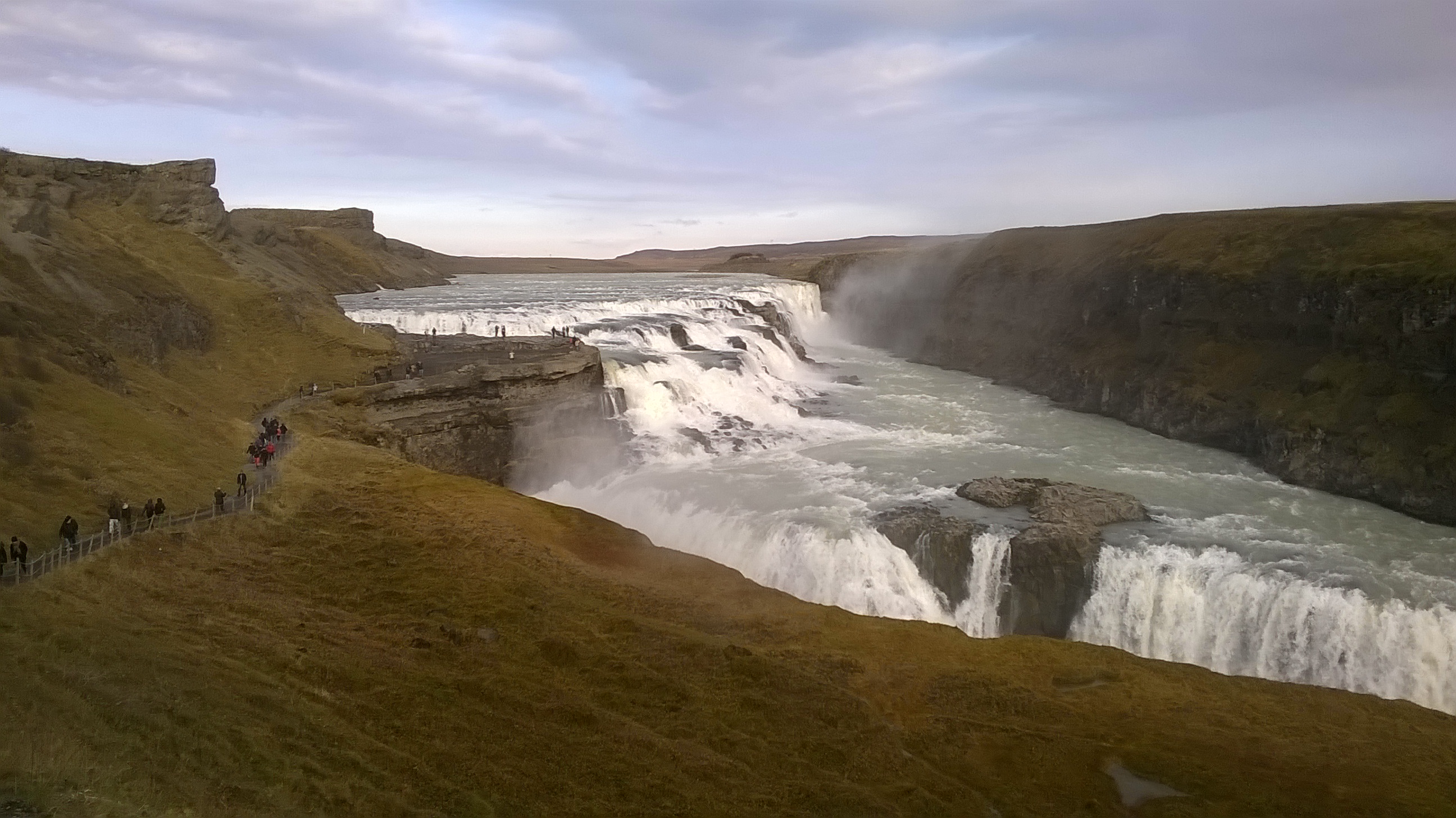 I arrived on Iceland at the afternoon. When I m leaving the airport I can feel how the cold air goes under my thin cloth. However I do not care, my complete attention is focused on the impressive landscape. It is a mixture of tundra and volcanic landscape. When I buy my busticket I get my first shock, the prices for transportation are extremely high. A bus ticket from the airport to Rekjavic costs almost 2000 ISK. However I will fall in love with this country. The beautiful landscape and the kindness of the Islanders are gorgeous. When I want to book my first trip in Island the woman from the hostel give me the advice to try hitch-hiking or to call the man on a paper who is looking for people to share a car and costs for petrol. Perfect I arrange it and the next day my first trip “The Golden Circle” route starts. We are driving through a landscape which reminds me a little bit to the Drakensberge in South Africa but it is still different because in the next moment it is tundra like in Russia. I can only repeat me. We arrive at the first attraction the Thingvellir National Parc where the two continental plates come together and the first parliament of Iceland was founded. From the information center we have a beautiful view on a lake behind which is reflecting the sun. However the thermometer say it is only 4 degree celcius. The next attraction is a geyser. You can smell sulphur in the nose which comes from the multiple hot springs around the geyser. It is getting colder and colder and we drive further to Gulfoss a massive waterfall.