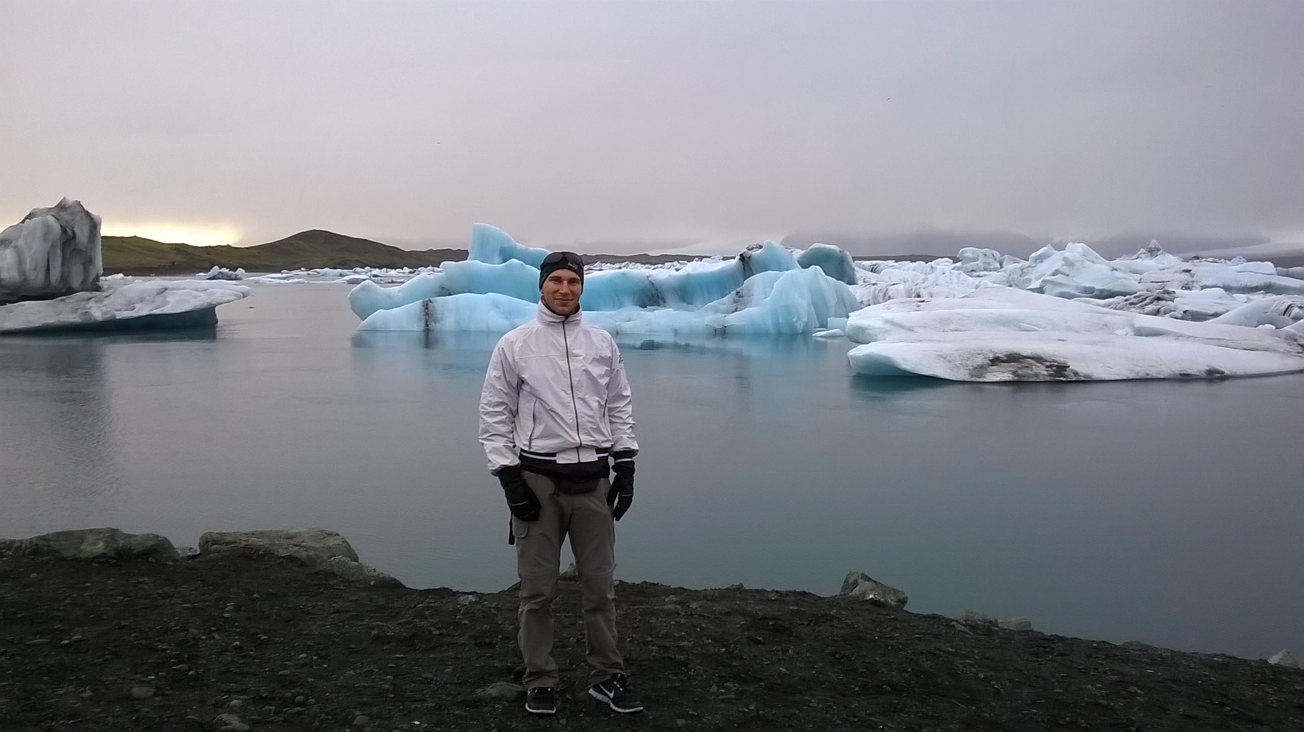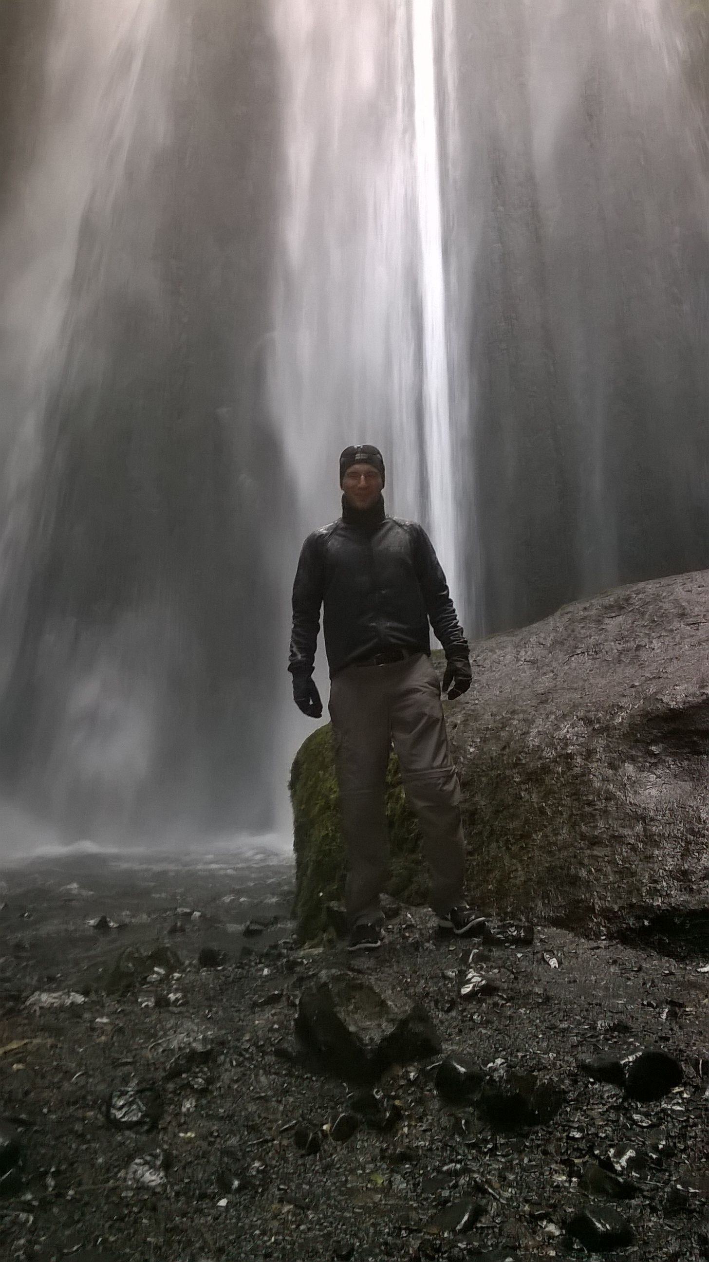 The cold water is whipped into our faces by the wind. Behind the waterfall you can see a glacier far away. On the way back we are have a beautiful sunset but the northern lights we can not see. The next day we do a trip to the glacier lagoon Jökularson at the south coast 330 km away from Rekjavic. On the way we see beautiful waterfalls (smaller than yesterday) but we can go behind it. The other one is in a cave. Have you ever seen a waterfall in cave. If you want to see one I can recommend to bring your rain jacket with you. 😉 It is getting wet inside. After the waterfall we have done a little hike and continued our road trip. Another highlight is one of the most beautiful beaches on Iceland: The beach in Vik which consists of lavastone sand. It is very fine and completely black. In the sea are small rock formations. Finally we arrive the glacier lagoon and are only impressed. I have never seen a iceberg before but the different colours especially the blue in the icebergs is …sorry I do not find a word to describe it. We just stand there and have done nothing until we saw the first seal. We tried to come closer but it swims away so we decided to do pictures. By the way have you ever heard how it sounds when a part of a glacier falls into the sea. Incredible. When we drove back we tied again to see the northern lights without success but we agreed that because of the view on the icebergs and the glacier the long drive was worth it. With a large package of memories I will leave now Iceland heading to New York.